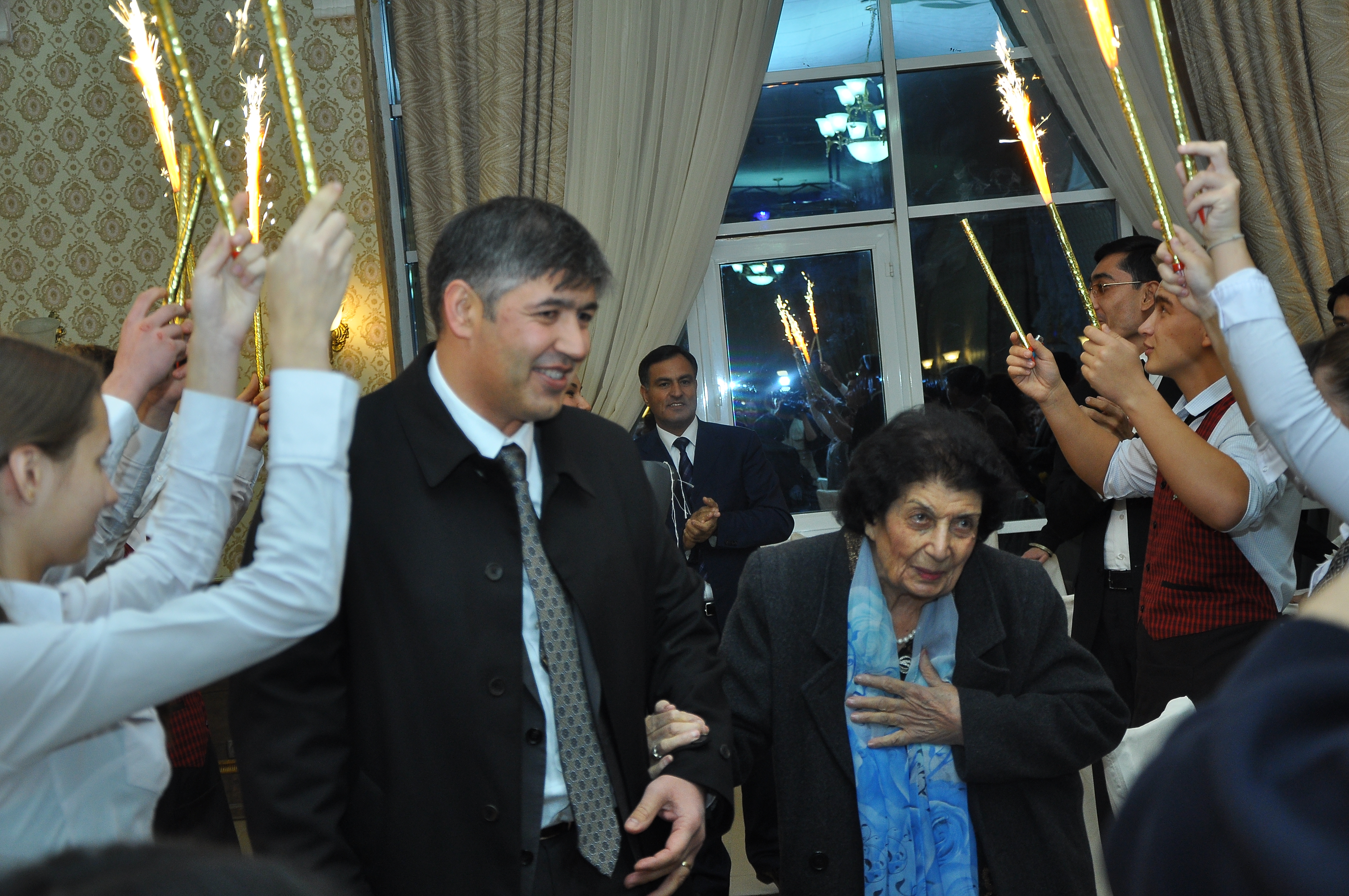 Провели сквозь туннель из бенгальских огней.