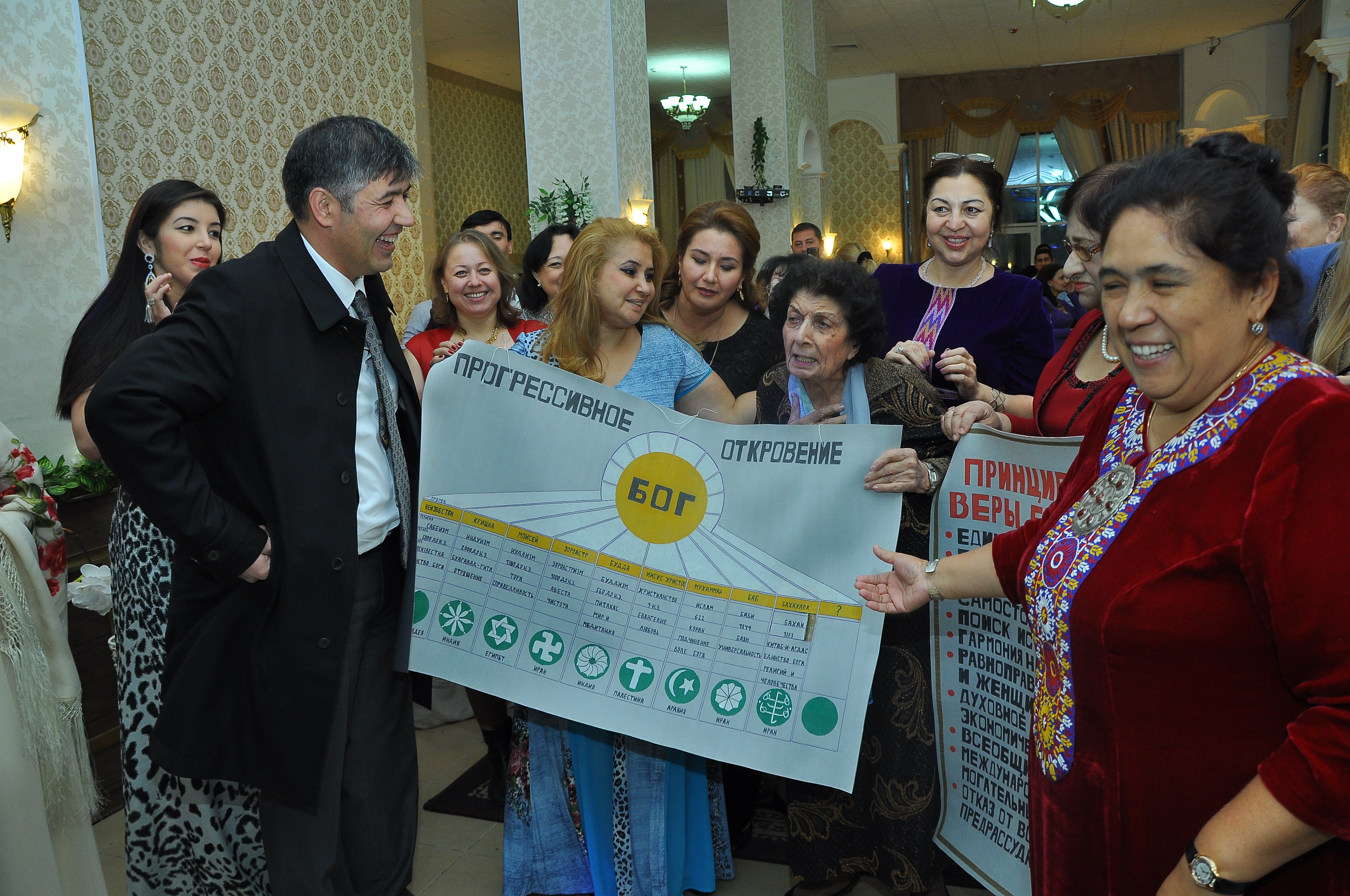 Выход всё же нашли — мы пригласили именинницу будто бы на углубление к новым друзьям. Конечно же, она тут же согласилась. Так её, ничего не подозревающую, и привезли в ресторан… с книгами, плакатами о принципах нашей Веры, с материалами о преемственности религиозной идеи.