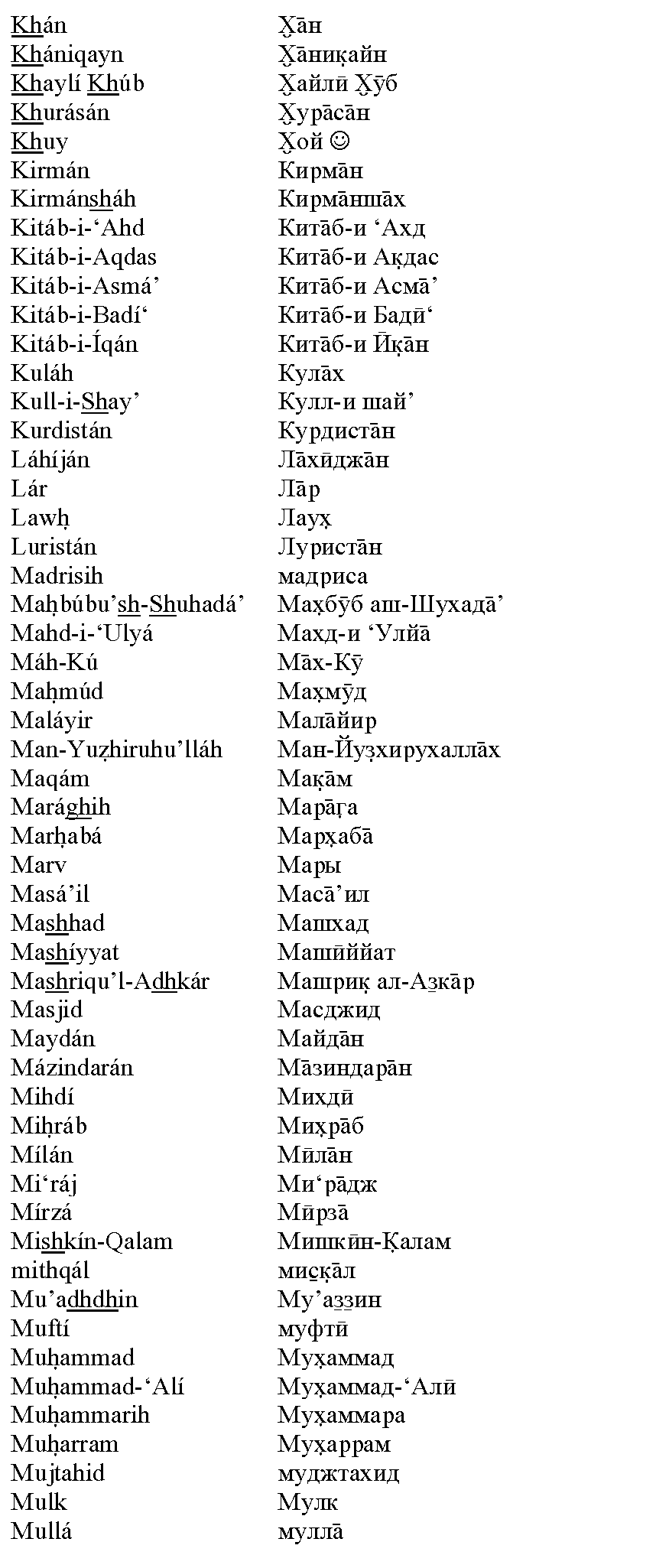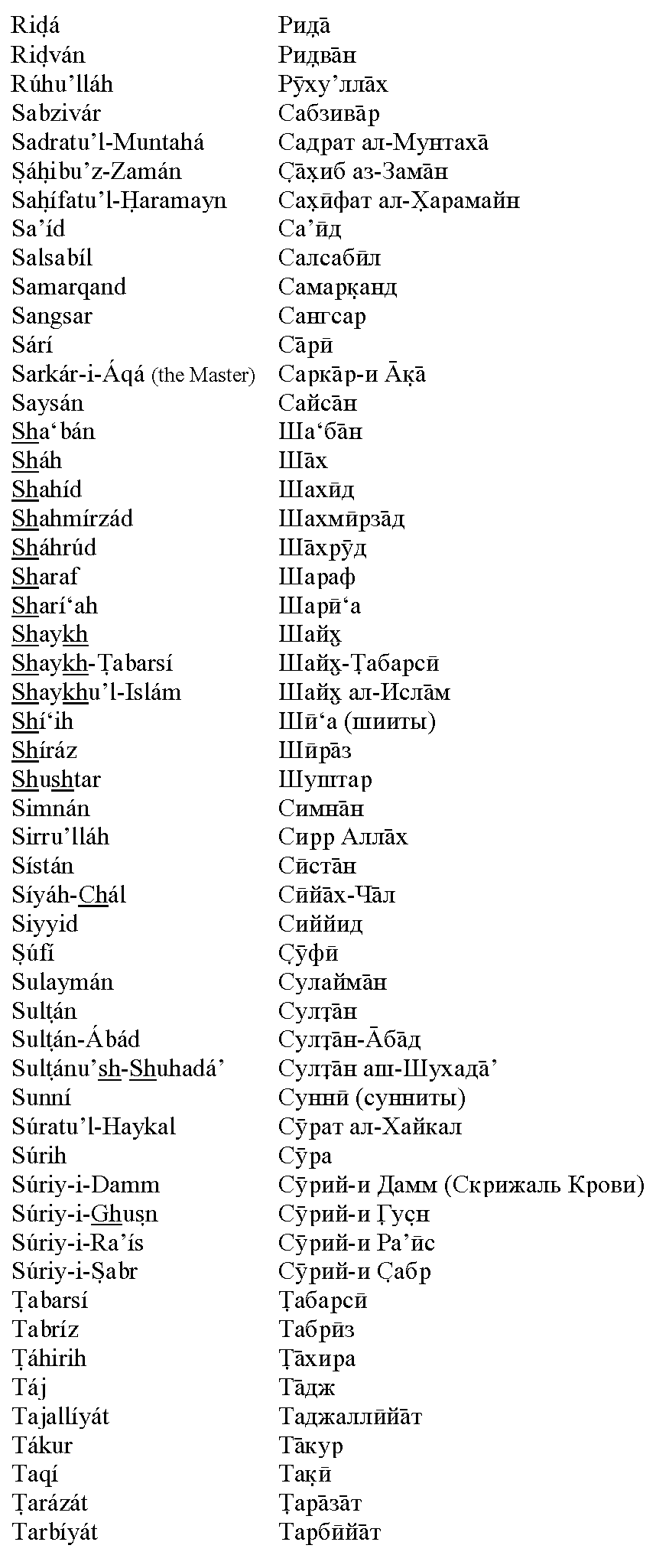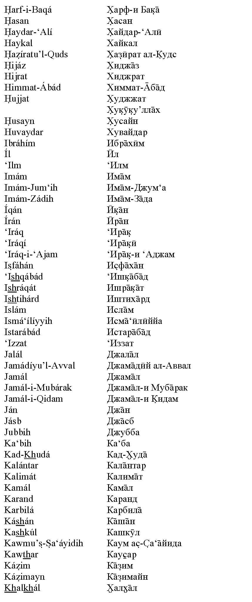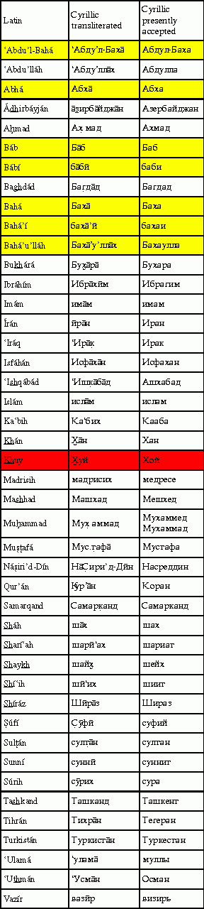 Ещё в начале XX века Шоги Эффенди, Хранитель Веры Бахаи, увещевал всех верующих использовать при написании персидских и арабских имён и терминов систему транслитерации. Сам он выбрал такую систему для латиницы, а вопрос с другими алфавитами остался открытым. Полное обсуждение данного вопроса, со всеми цитатами, вы можете скачать в виде PDF-файла или в виде файла MS Word с внедрёнными шрифтами.